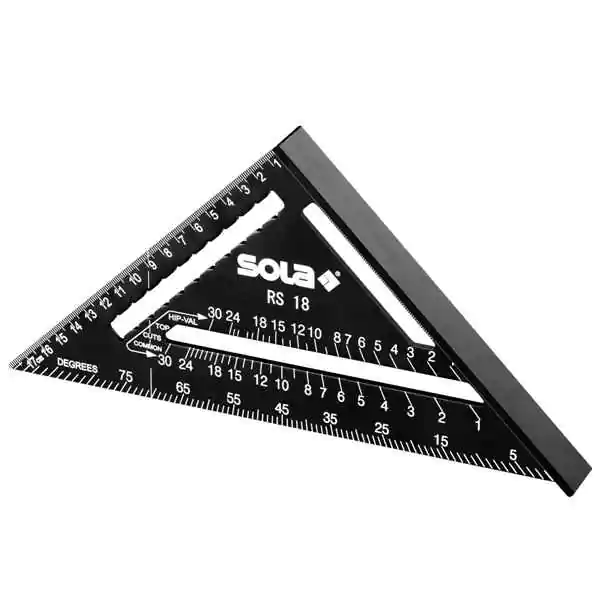 • Krovni uglomeri SOLA RS 18 i RS 30 predstavljaju profesionalne alate namenjene preciznom obeležavanju i merenju uglova pri izradi i montaži krovnih konstrukcija. Ovi modeli, dužine ivica 18 cm i 30 cm, izrađeni su u obliku jednakokrakog pravouglog trougla sa T-ivicom na jednoj strani, čime kombinuju funkcije lenjira, ugaonika, merača uglova i merača rogova u jednom alatu.