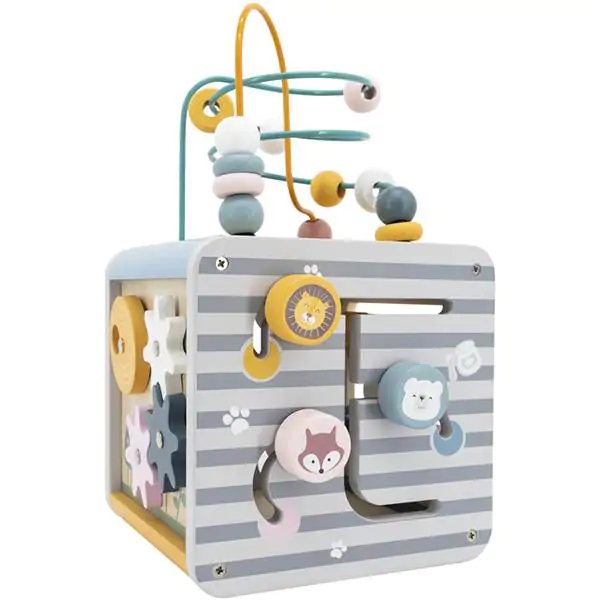 • Na zidovima edukativne kocke nalazimo: - sorter oblika sa figurama životinja (jež, zebra, slon i veverica), - lavirint sa životinjama, - 3 rotirajuća zupčanika i 1 krug sa rupom, - dvostrane, rotirajuće kocke sa brojevima od 1 do 6