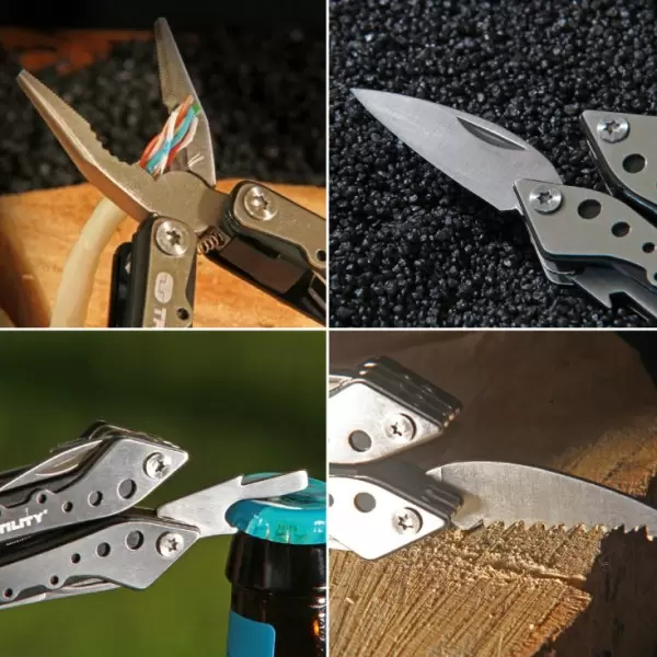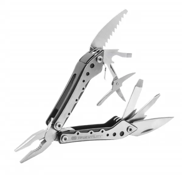 • Od alata poseduje sledeće: krstasti šrafciger, makaze, otvarač za flaše, srednji i veliki pljosnati šrafciger, malu testeru, kombinovana klešta, sečice, turpiju i nož