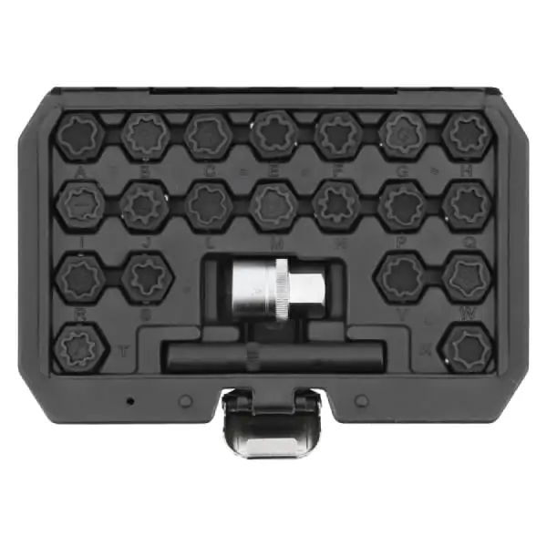 • Uvereni u efikasnost i izdržljivost, YATO set od 22 čaure za sigurnosne matice predstavlja specijalizovano resenje za auto-servise i vulkanizerske radionice. Ovaj profesionalni set je dizajniran za brzo i pouzdano uklanjanje sigurnosnih matica na vecini Audi vozila proizvedenih izmedju 2002. i 2012. godine. Svaka caura je izradjena od visokokvalitetnog hrom-molibdenskog (CrMo) celika, sto garantuje izuzetnu cvrstinu i otpornost na udarna opterecenja i habanje. Zastitni oksidni premaz dodatno sprecava koroziju i produžava radni vek alata. Standardni prihvat od 1/2" (12.7 mm) obezbedjuje kompatibilnost sa profesionalnim udarnim alatima i rucnim kljucevima, omogucavajuci direktnu i mocnu primenu. Set pokriva sirok spektar velicina (A, B, C, E, F, G, H, I, J, L, M, N, P, Q, R, S, T, V, W, X), cime obezbedjuje spremnost za razlicite modele. Ovo je neophodan alat za svakog profesionalca koji trazi preciznost, brzinu i sigurnost u radu na tockovima.