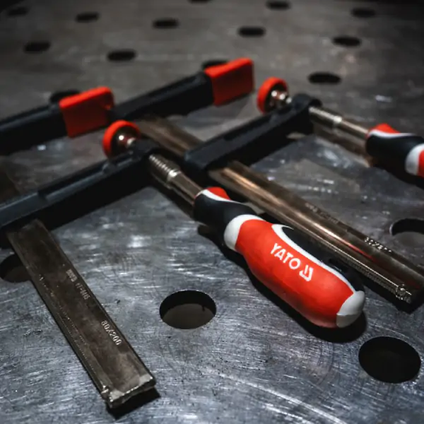 • YATO stolarska stega F-tipa dimenzija 1000/120 predstavlja vrhunski alat dizajniran za najzahtevnije stolarske i montažne radove, gde je neophodna maksimalna stabilnost, veliki radni domet i apsolutna čvrstoća pri stezanju velikih radnih komada. Njeno telo, konstruisano od debelih i stabilnih šina sa dodatnim strukturalnim ojačanjima, pruža izuzetnu otpornost na savijanje i torziju pod intenzivnim opterećenjem, čime se obezbeđuje sigurno i pouzdano fiksiranje i poravnavanje. Vijak sa posebno izrezbarenim navojem, zajedno sa ojačanim profilom ruku, garantuje glatko i moćno stezanje, dok je ergonomska drška obložena mekim tehničkim materijalom za udobniji, sigurniji i snažniji hvat koji smanjuje zamor tokom produženog rada. Ključnu funkcionalnost za očuvanje kvaliteta obrade pruža pritisna ploča montirana na kuglastom zglobu, koja se automatski prilagođava uglu površine, i mekane plastične obloge koje štite finu površinu drveta od oštećenja, udubljenja i ostavljanja tragova. Ova robusna i svestrana stega je neophodna u svakoj profesionalnoj stolarskoj radionici, fabrici nameštaja ili montažnoj hali, gde se ceni dugotrajnost, preciznost i zaštita kvaliteta finalnog proizvoda u velikim formatima.